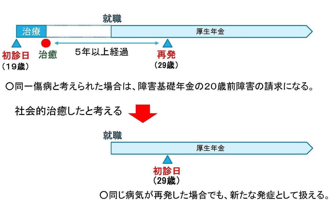 ただし、過去に発症した病気が 社会的治癒 と認められた場合、再発後の受診日を「新しい初診日」として取り扱えるというメリットがあります。