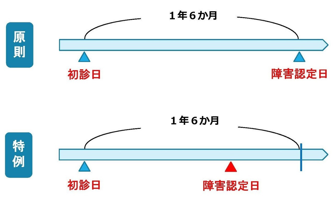 障害認定日は、原則として初診日から1年6か月を経過した日となります。ただし、1年6か月を待たずに特例要件に該当した場合には、その時点を障害認定日として取り扱います。