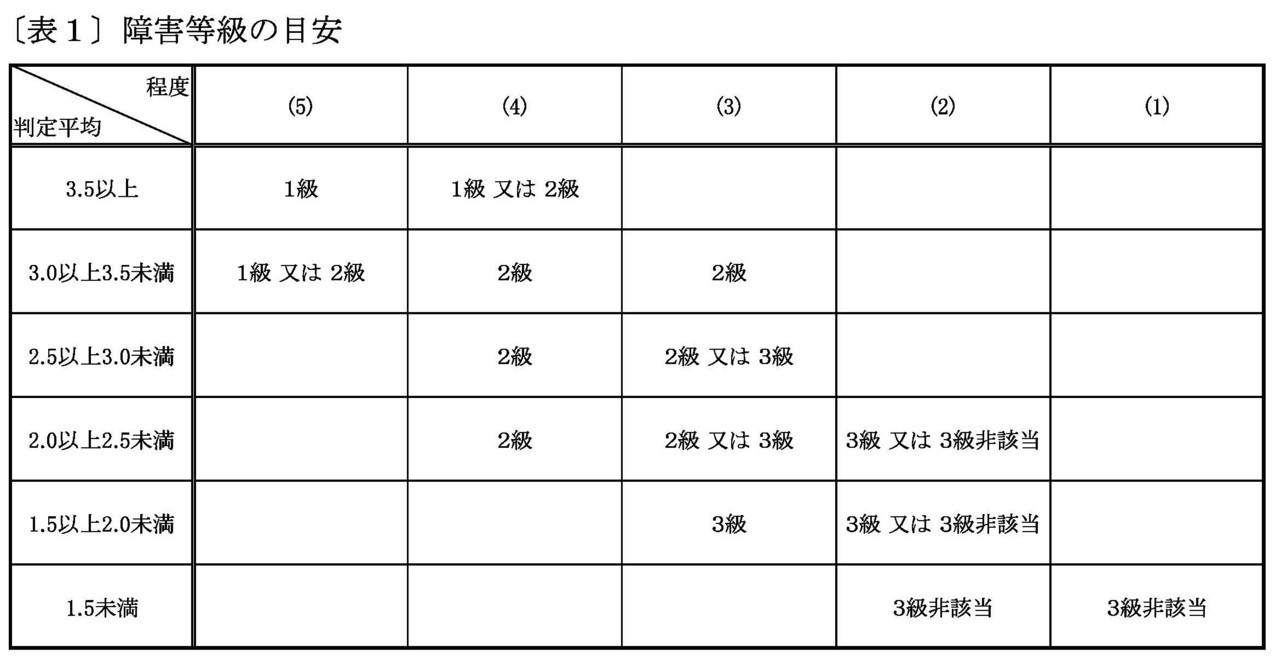 精神の診断書に記載される「日常生活能力の程度」と「日常生活能力の判定」の評価を組み合わせ、その平均値からおおよその障害等級を判断する目安を示しています。(表1参照)